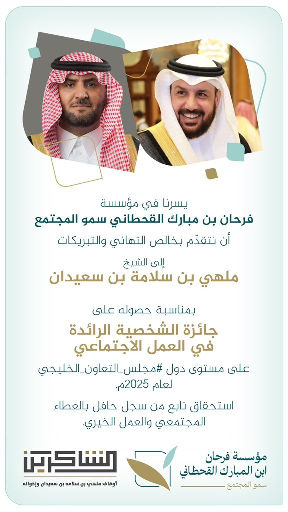 يسرنا في موسسة فرحان بن مبارك القحطاني سمو المجتمع أن نتقدّم بخالص التهاني والتبريكات الى الشيخ ملهي بن سلامة بن سعيدان بمناسبة حصولة على جائزة الشخصية الرائدة في العمل الاجتماعي على مستوى لدول #مجلس_التعاون_الخليجي لعام 2025م. استحقاق نابع من سجل حافل بالعطاء المجتمعي