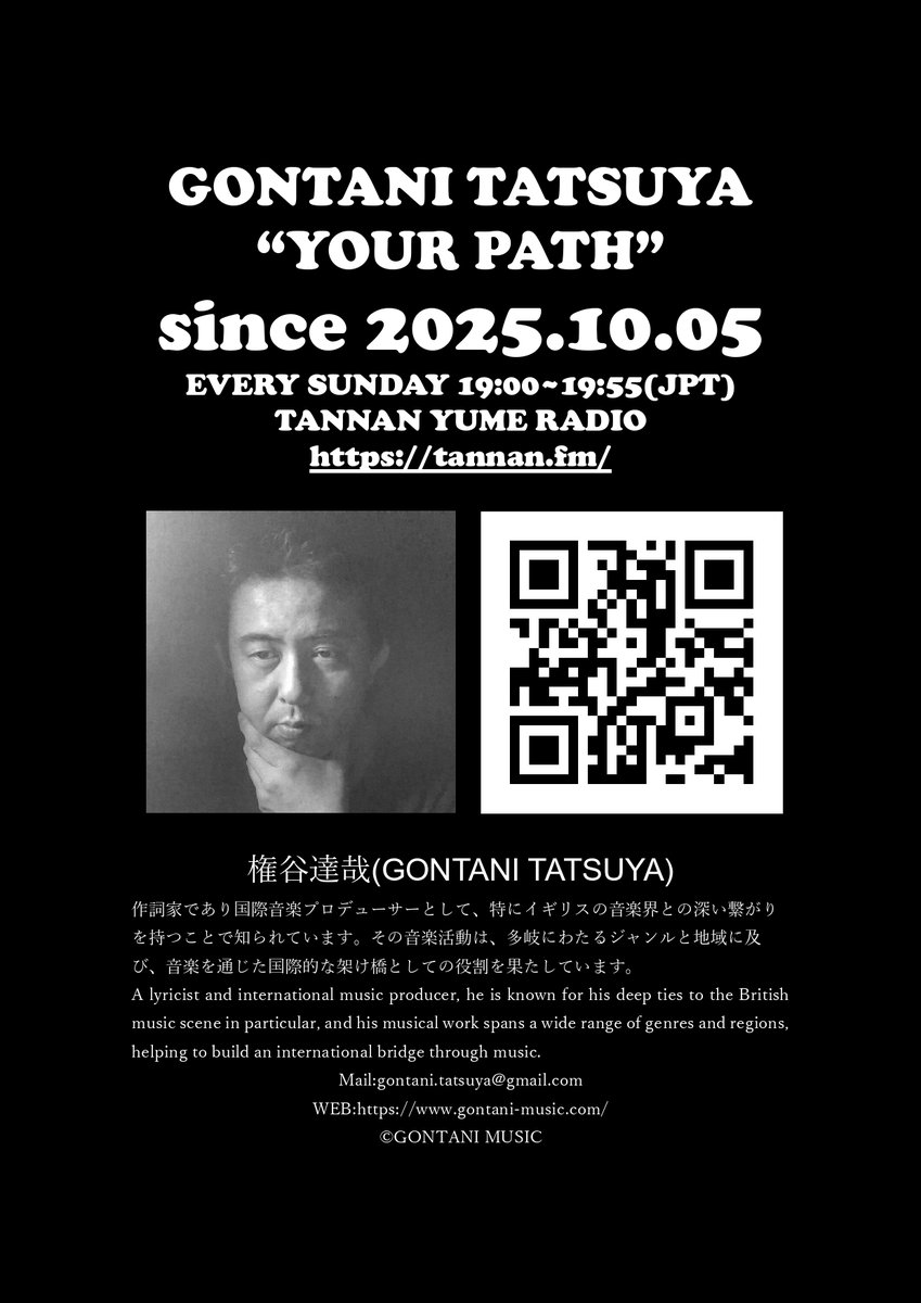 follow - Gontani Music I am a Japanese lyricist. Won't you work with us? Won't you join my radio music program in Japan? PROFILE LINKS GONTANI MUSIC gontani-music.com Instagram instagram.com/tachuya1973/ facebook facebook.com/gontani.tatsuya twitter/X x.com/gontani_net