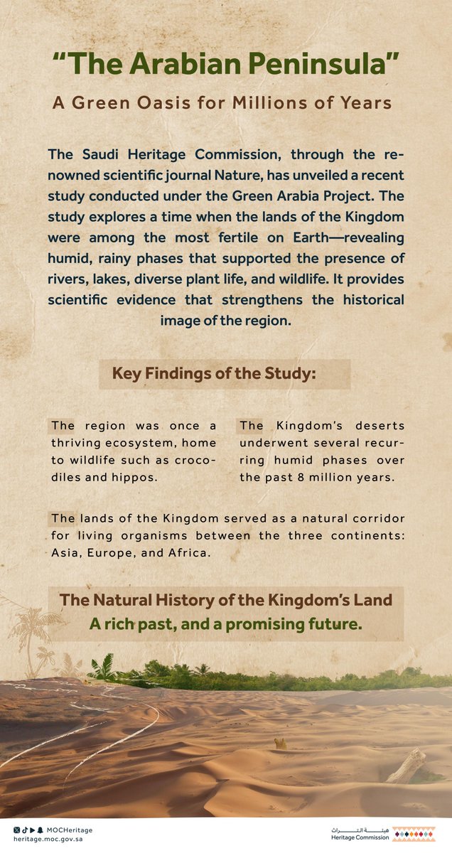 بفضل الله وتوفيقه، تم نشر بحث جديد لي مع كوكبة من الباحثين في مجلة Nature الأم، تحت مظلة هيئة التراث وبدعم من سمو بدر بن عبدالله بن فرحان آل سعود و د.جاسر بن سليمان الحربش ومشاركة العديد من الجهات. جامعة الملك سعود وثّقت هذه الدراسة لأول مرة مناخ الجزيرة العربية على مدى ٨ مليون سنة. ١/ ٥ nature.com/articles/s4158…